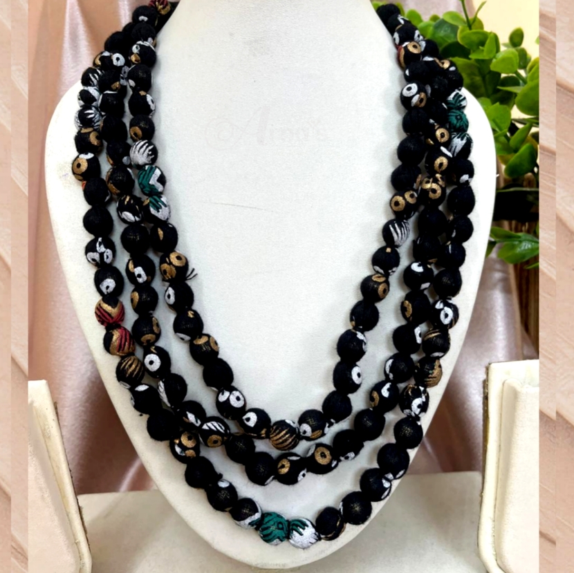 3LDORI46- ARNAS 1 PC PACK OF THREE LAYER FABRIC AND BEADS BLACK PRINTED TASSEL | DORI FOR JEWELLERY MAKING